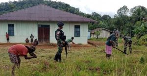 Anggota TNI Satgas Pamtas Statis RI-PNG dari Pos Upkim mengajak masyarakat kampung Upkim Distrik Waropko untuk gotong royong bersama menjaga kebersihan lingkungan sekitar tempat tinggal agar terhindar dari serangan penyakit dan hewan berbahaya.