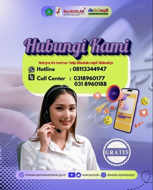 Semua pelayanan yang diberikan oleh Disdukcapil Kabupaten Sidoarjo bersifat gratis. Jika ada pihak yang menghubungi dan mengaku sebagai petugas Disdukcapil Kabupaten Sidoarjo agar segera melaporkan kepada Disdukcapil Kabupaten Sidoarjo atau pihak Desa/Kelurahan, pihak Kecamatan maupun Kepolisian setempat untuk ditindaklanjuti. (HS)