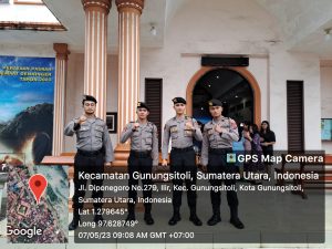 Personil Polres Nias gelar Pengamanan jalannya kebaktian Ibadah Minggu, dengan menempatkan Personil di setiap Gereja seputaran Kota Gunungsitoli, Minggu (07/05/2023) pagi.