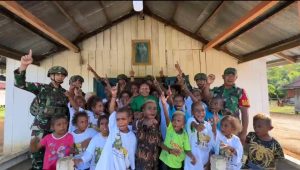 Dengan suasana kedekatan ini diharapkan kedepannya akan terjalin sinergitas anatar anak generasi penerus bangsa dengan Prajurit TNI, ucap Ibu Ayubi Ibu Pendeta setempat. (Yonif 642)