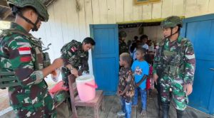 Anak-Anak Kampung Masyeta Antusias Terima Bubur Kacang Hijau Dari Satgas Yonif 642/Kps