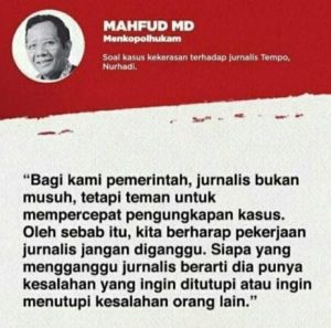 Dalam Himbauan selembaran yang beredar bahwa Mahfud MD mengatakan “Bagi Kami Pemerintah, Jurnalis Bukan Musuh, Tetapi Teman Untuk Mempercepat Pengungkapan Kasus, oleh sebab itu, kita berharap pekerjaan jurnalis jangan diganggu, siapa mengganggu jurnalis berarti dia punya kesalahan, yang ingin ditutupi atau ingin menutupi kesalahan orang lain”, ujarnya. (Humas, Editor by [email protected]).