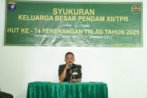 Pontianak | suaraindependentnews.id – Keluarga besar Penerangan Kodam (Pendam) XII/Tanjungpura menggelar acara syukuran dalam rangka memperingati Hari Ulang Tahun (HUT) ke-74 Penerangan TNI Angkatan Darat. Bertempat di Media Center Kodam XII/Tpr, Jalan Teuku Umar, Kota Pontianak Senin (13/1/2025)