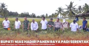 Demi mendukung program tersebut, Bupati Nias hadir langsung di tengah hamparan sawah untuk mengikuti jalannya kegiatan Panen Raya Padi Serentak. Sambil melaksanakan kegiatan panen raya, Bupati Nias menyempatkan diri untuk berbincang-bincang dengan para petani.
