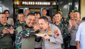 Momen penuh keakraban dan kegembiraan mendadak pecah, ketika puluhan TNI memasuki Mapolres Kebumen sambil menyanyikan selamat ulang tahun di hari Bhayangkara.