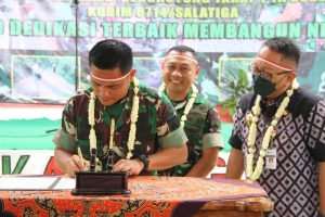 Penandatanganan Naskah Penyerahan Hasil Kegiatan TMMD Sengkuyung I Tahun 2022 pun dilakukan Dandim 0714/Salatiga yang di saksikan oleh Bupati Semarang bersama pejabat Forkopimda kabupaten Semarang.