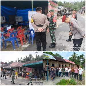 Pelaksanaan PSU (Pemilihan Suara Ulang) Pilkada Gubsu/Wagubsu, Bupati/Wakil Bupati Nias Selatan Tahun 2024 di TPS 1 dan 2 Desa Hilizalootanò Larono, Kecamatan Mazino, dan TPS 03 Desa Bawodobara Kecamatan Teluk Dalam Kabupaten Nias Selatan pada hari kamis tanggal 05 Desember 2024, pukul 08.00 wib s/d selesai di Monitoring oleh Danramil-12/Teluk Dalam bersama Personil Koramil-12/Teluk Dalam sesuai dengan Tugas dan Tanggung jawab di Wilayah Teritorial dalam pelaksanaan Pilkada Serentak tahun 2024 di Kabupaten Nias Selatan (Nisel). Kamis (05/12/2024).