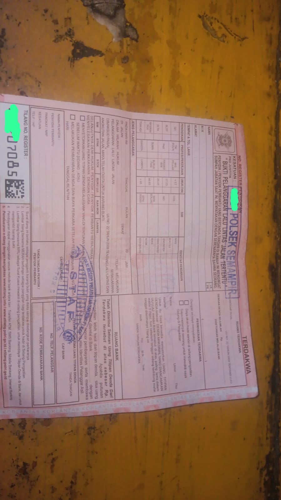 Menurut Peraturan Kapolri Nomor 12 Tahun 2009 dan Peraturan Mahkamah Agung Nomor 12 Tahun 2016, surat tilang wajib diisi lengkap sebagai dokumen sah yang mencatat identitas pelanggar, petugas penindak, pasal yang dilanggar, serta jadwal persidangan atau denda.