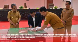 Pada rapat yang dipimpin langsung oleh Ketua DPRD Kabupaten Nias menyampaikan secara resmi kepada Pemerintah dan Masyarakat bahwa pada Rapat Paripurna DPRD Kabupaten Nias akan mengumumkan Penetapan Bupati dan Wakil Bupati Nias Terpilih Hasil Pilkada 2024 yakni Pasangan Calon Yaatulo Gulo, S.E., S.H., M.Si dan Arota Lase, A.Md sebagai Bupati Nias dan Wakil Bupati Nias, sebagaimana telah ditetapkan oleh KPU Kabupaten Nias.