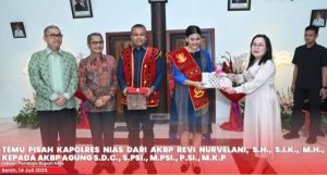 Pelaksanaan Acara Temu Pisah Kapolres Nias dari AKBP Revi Nurvelani, S.H., S.I.K., M.H (Pejabat Lama) kepada AKBP Agung S.D.C., S.PSI., P.SI., M.K.P (Pejabat Baru), bertempat di Pendopo Bupati Nias. Senin, 14 Juli 2025.