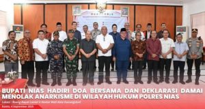 Bupati Nias Yaatulo Gulo, S.E., S.H., M.Si menghadiri acara Doa Bersama dan Deklarasi Damai Menolak Anarkisme di Wilayah Hukum Polres Nias. Kegiatan yang diselenggarakan oleh Forkada se-Kepulauan Nias bertempat di Ruang Rapat Lantai II Kantor Wali Kota Gunungsitoli. Kamis, 04 September 2025.