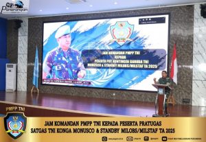 Bogor | suaraindependentnews.id , (24 April 2025) – Komandan PMPP TNI Mayjen TNI Taufik Budi Santoso, S.Hub.Int., M.H.I. memberikan pembekalan kepada peserta Pre Deployment Training (PDT)/Pratugas Satgas TNI Kontingen Garuda (Konga) MONUSCO dan standby Milobs/Milstaf TA 2025 di Auditorium PMPP TNI, Sentul, Bogor, Senin (21/04/2025).