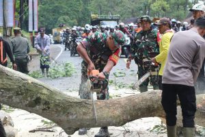 Jelang Nataru Kodim 0610/Sumedang Bersama Polres Sumedang Bersinergi Lakukan Penebangan Pohon di Jalur Cadas Pangeran