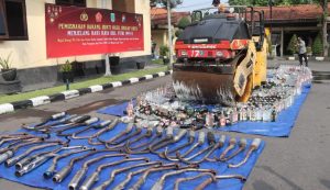 “Kami telah berhasil mengamankan Barang Bukti berupa Ratusan Knalpot Brong dan Minuman Keras Ilegal yang akan dimusnahkan dengan cara di potong dan dilindas oleh kendaraan Slander”, ungkapnya.
