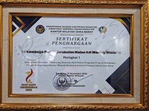 Penghargaan ini diberikan dalam kategori penguatan ketahanan pangan sebagai bentuk apresiasi atas inisiatif dan program yang dijalankan Lapas Warungkiara untuk meningkatkan kemandirian pangan warga binaan.