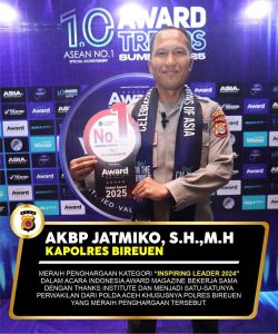 Bireuen | suaraindependentnews.id – Kapolres Bireuen AKBP Jatmiko SH MH, menerima piagam penghargaan Inspiring Profesional dan Leadership Award sebagai pemimpin yang menginspirasi