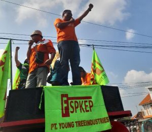 Karyawan Pt. Young Tree Industries yang tergabung dalam PUK SPKEP PT. Young Tree Industries melakukan unjuk rasa damai di karenakan ada 182 orang yang merupakan Anggota Serikat Pekerja di PHK secara sepihak oleh Perusahaan.