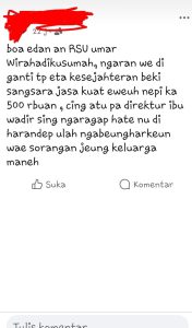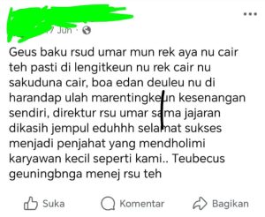 “geus baku rsud umar mun rek aya nu cair pasti dilengitkeun nu rek cair nu sakuduna cair, boa edan deuleu nu diharandap ulah marentingkeun kasenangan sendiri, direktur rsu umar sama jajaran dikasih jempul eduhhh selamat sukses menjadi penjahat yang mendholimi karyawan kecil seperti kami.. teu becus geuningbnga menej rsu teh”.