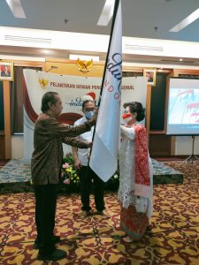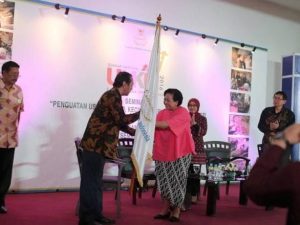 Tongkat estafet kepengurusan berupa Bendera Pataka indukUMKM Indonesia diserahkan kepada Ketua Umum yang baru, Nana Riwayatmu.
