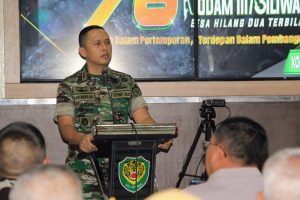 “Hari ini saya mewakili seluruh keluarga besar Kodam III/Slw mengucapkan terimakasih atas kehadiran tamu undangan semua dan kehadiran bapak/ibu menjadi berkah kami semua. Pada usia ke 78 tahun ini sudah banyak sejarah yang dilewati dan dijalani seperti yang sudah kita saksikan dalam tayangan tadi. Pada saat ini kami melakukan operasi selain perang dengan membantu rakyat dan pemerintah dalam pembangunan bersama dengan instasi lainnya”, ucapnya.