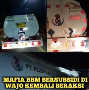 Praktik mafia BBM di Wajo kembali terkuak. “Baba”, seorang pemilik penampungan solar, diduga kuat terlibat dalam penyalahgunaan BBM bersubsidi jenis solar yang dijual ke PT. Rezeki Multi Energi. Warga Wajo menduga PT. Rezeki Multi Energi dilindungi oleh oknum anggota Polri di Polda Sulsel, membuat “Baba” terkesan kebal hukum.