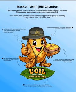 Sementara itu, tangan Ucil yang menyuguhkan potongan ubi matang menggambarkan keramahan dan ajakan untuk menikmati kelezatan khas Sumedang, sekaligus simbol pelayanan Polri yang tulus dan terbuka. Elemen daun pada Ucil mempresentasikan berbagai program Polres Sumedang dalam mendukung, mempromosikan, dan melestarikan Ubi Cilembu sebagai potensi unggulan daerah.