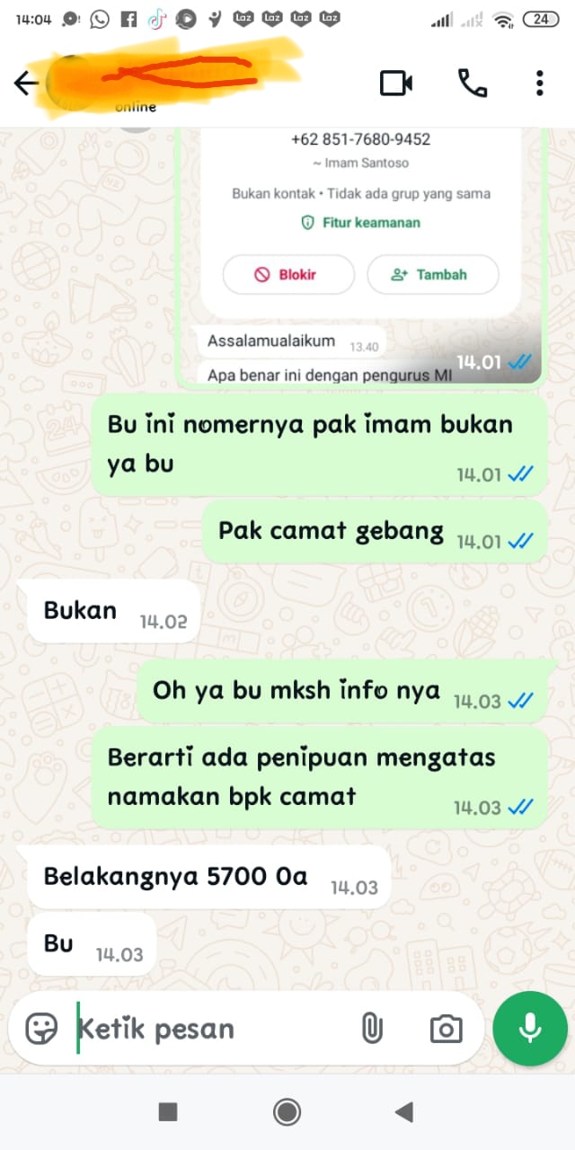 Nama Camat Gebang Dicatut! Waspada Penipuan Pakai Nomor WhatsApp Menawarkan Bantuan.