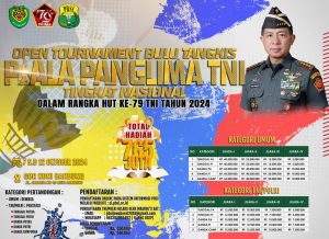 BANDUNG-JABAR || suaraindependentnews.id – Open Tournament Bulutangkis Piala Panglima TNI Tingkat Nasional dalam rangka HUT ke 79 Tahun 2024 dengan total hadiah 765 Juta segera digelar di GOR Koni Kota Bandung tanggal 7 sampai dengan 12 Oktober 2024.