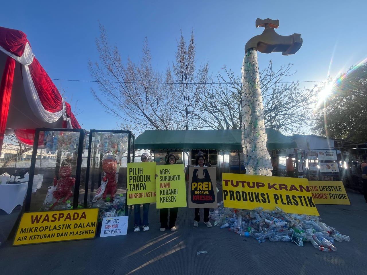 Untuk meningkatkan kesadaran masyarakat Surabaya DLH Kota Surabaya dan Ecoton menghadirkan pameran seni instalasi berupa kran raksasa seringgi 7 meter yang berisi pesan agar masyarakat menghentikan konsumsi botol plastik yang sudah membanjiri lingkungan Surabaya, selain itu pameran juga menampilkan foto dan ringkasan penelitian tentang bahaya mikroplastik dan 2 replika bayi dalam aquarium berukuran 1 meter x 1 meter dengan tinggi 2 meter. ” replikas bayi ini menggambarkan jika rahim yang selama ini menjadi teman aman bagi bayi-bayi kini sudah terkontaminasi mikroplastik, selain air susu ibu yang telah terkontaminasi mikroplastik organ perempuan lain yanf diketahui terkontaminasi mikroplastik adalah plasenta, air ketuban dan air seni ibu hamil” ungkap Rafika Aprilianti, lebih lanjut peneliti mikroplastik Ecoton ini menjelaskan bahwa keberadaan mikroplastik dalam tubuh manusia akan memicu