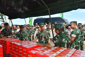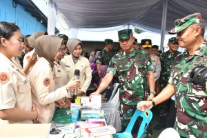 Panglima TNI tampak menyapa warga yang sedang memeriksakan kesehatan, berdialog dengan petugas medis, dan memberikan semangat kepada masyarakat yang hadir. Kehadiran Panglima TNI mencerminkan perhatian langsung terhadap pelaksanaan kegiatan serta komitmen TNI dalam mendukung pelayanan kesehatan bagi rakyat.
