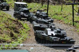 Demonstrasi terhadap simulasi tempur gladi model remot kontrol mengambil materi latihan perang darat, yaitu gerilya.