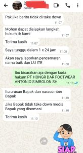 Namun saat dijawab untuk membicarakan dengan pihak Kuasa Hukum PT HONG DAR FOOTWEAR, pelaku memberikan jawaban yang bernada ancaman.