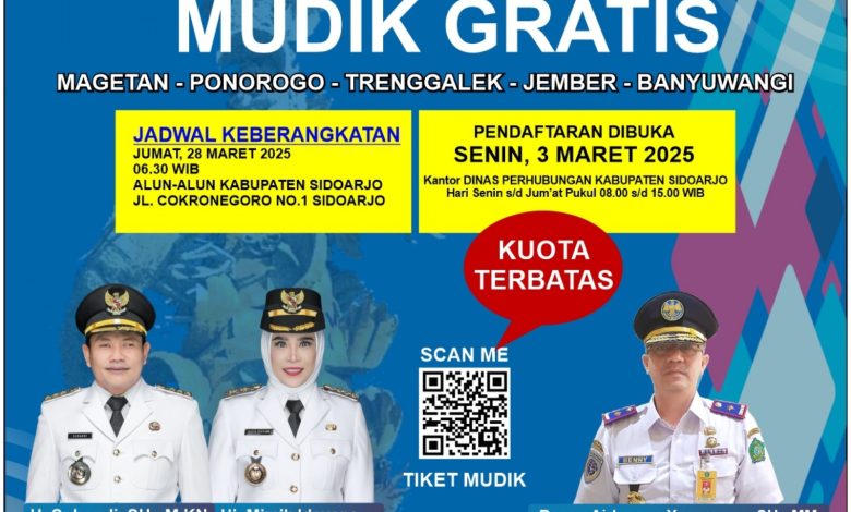 Suaraindependentnews.id, Sidoarjo – Pemkab Sidoarjo kembali memberikan layanan mudik gratis untuk masyarakat pada lebaran tahun ini. Pendaftarannya sudah dibuka mulai tanggal 3 Maret 2025.