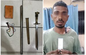 Saat tiba di lokasi, petugas menemukan seorang pria berinisial MT alias AIS (20) dengan senjata tajam jenis pisau sangkur bergagang garuda.