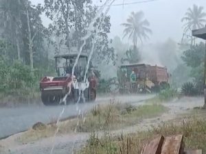 Pengaspalan Jalan Disaat Hujan Deras, Kwalitas Mungkin Sangat Diragukan