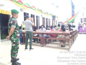 Ibadah Perayaan Natal bagi Umat Nasrani minggu 24 Desember 2023 pukul 20.00 wib yang di laksanakan tiap – tiap Gereja di Kabupaten Nias Selatan Personil Koramil-12/Teluk Dalam Kodim-0213/Nias melaksanakan Pengamanan untuk mencegah hal – hal yang tidak di inginkan. Minggu (24/12/2023).