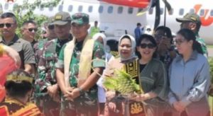 Pjs.Bupati Nias Ir. Yuliani Siregar, M.AP sambut kedatangan Asisten Perencanaan (Asrena) Kasad Mayjen TNI I Gusti Ngurah Wisnu Wardana, S.E beserta rombongan di Bandara Binaka Gunungsitoli, Senin (21/10/2024).