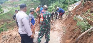 Polsek Cikajang bekerja sama dengan FKPM Polsek Cikajang, tim PUPR, aparatur Desa Cipangramatan dan warga sekitar segera membersihkan material longsor.