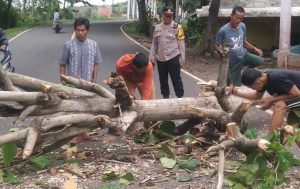 Hari Jum’at sekira pukul 15.30 WIB pohon tumbang menghalangi jalan di Jalan Lintas Selatan Kampung Cicadas Desa Cigadog Kecamatan Cikelet Kabupaten Garut.