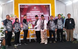 Ketua KPU Kabupaten Tasikmalaya beserta jajaran menyambut kedatangan rombongan Paslon Bupati-Wakil Bupati Tasikmalaya Koalisi Tasik MASLAHAT dan memeriksa berkas untuk validasi.