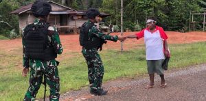 Anggota Satgas Pamtas Statis RI-PNG Yonif 111/KB dari Pos Kagewot disela tugas pokoknya melalui Binter Kitorang Basudara terapkan sikap teritorial dengan cara berikan senyuman, tegur sapa, di Kampung Kagewot Distrik Waropko Kabupaten Boven Digoel Papua Selatan.