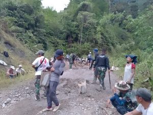 “Curah hujan yang cukup tinggi belakangan ini menyebabkan banjir yang berdampak kepada jalan akses ke Desa Guntembawang rusak”, kata Letkol Andy, Minggu (1/12/2024).