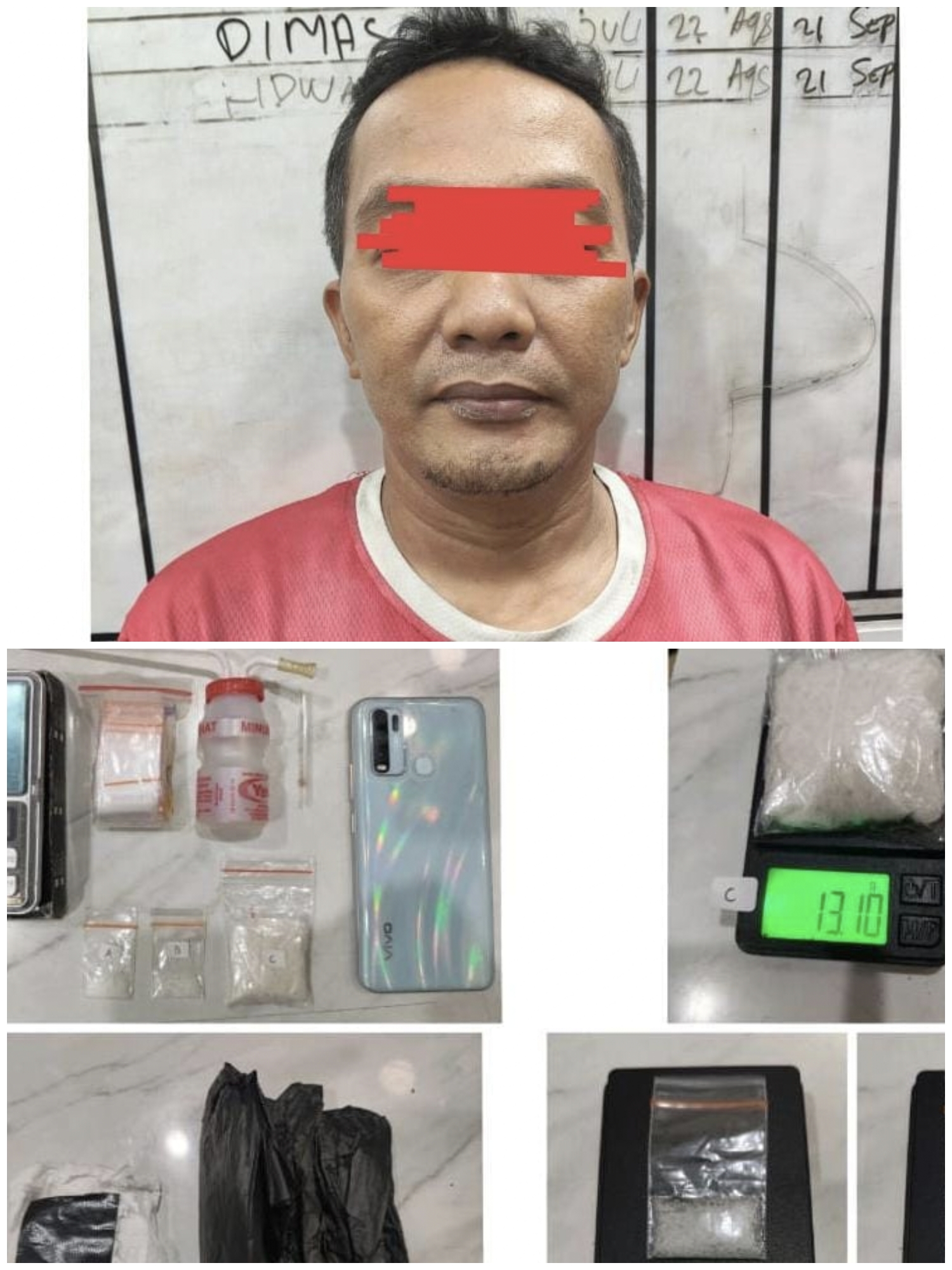 Saat dilakukan penggeledahan di rumah tersangka, petugas kembali menemukan barang bukti berupa satu klip plastik bening berisi sabu, satu unit timbangan digital, satu set alat hisap sabu, satu pak plastik klip bening, satu kantong plastik warna hitam, serta satu lembar kertas tisu yang dibungkus lakban hitam. Total barang bukti narkotika jenis sabu yang diamankan seberat 14,32 gram.