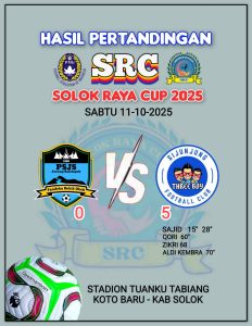 Solok, Suaraindependent.id — Turnamen Solok Raya Cup (SRC) 2025 kembali menghadirkan laga spektakuler pada Sabtu (11/10/2025) di Stadion Tuanku Tabiang, Koto Baru.