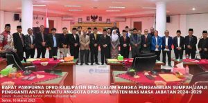 “Atas Nama Pemerintah Kabupaten Nias, kami menyambut baik pengambilan sumpah/janji saudara Alfrin Zebua sebagai Anggota DPRD Kabupaten Nias pengganti antar waktu dari Partai Golkar, sebagai tindak lanjut dari Keputusan Gubernur Sumatera Utara Nomor 188.44/208/KPTS/2025 Tanggal 5 Maret 2025 tentang Peresmian Pemberhentian dan Pengangkatan Pengganti Antarwaktu Anggota Dewan Perwakilan Rakyat Daerah Kabupaten Nias” Ujar Wakil Bupati Nias.