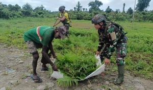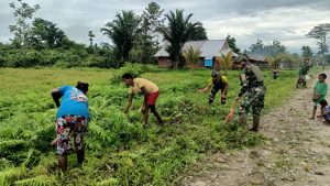Warga Semangat Kerja Bakti Bersama Satgas TNI Bersihkan Kampung Mumugu