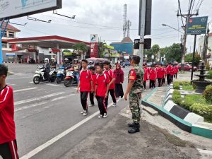 Surakarta | suaraindependentnews.id -, Babinsa Kelurahan Danukusuman Serda Tito Koramil 03/Serengan Kodim 0735/Surakarta mengamankan jalan sehat Anak-anak SMPN 22 Surakarta di Jln. Veteran Danukusuman Serengan Kota Surakarta. (31/01/2025).